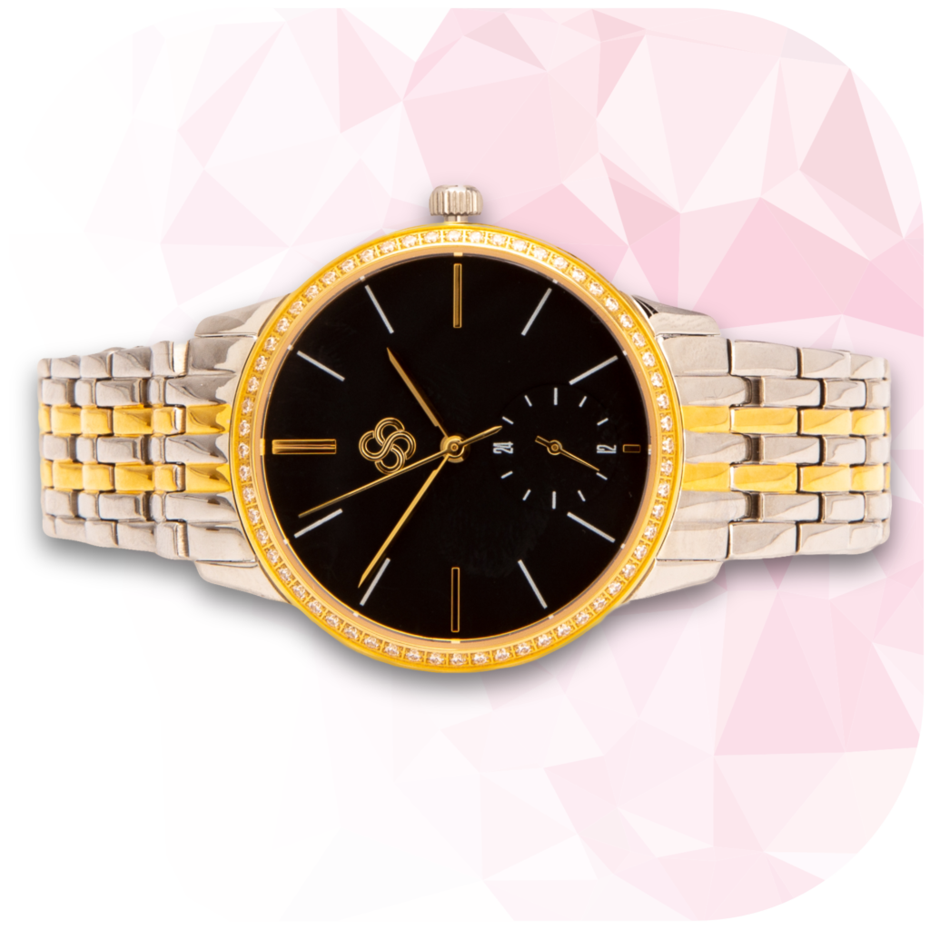 Created in a slightly smaller size, this watch features a black watch face highlighted by gold and silver minimalist hour markers. This is further enhanced by a silver and gold metal strap and detailed gem work on the frame that catches the light at every moment. All at once elegant and striking, the ISIS watch is stylish and can be worn from day and into the night.