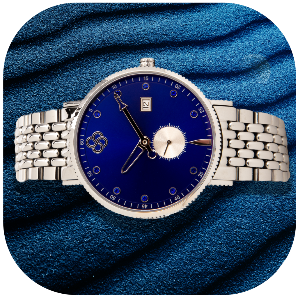 As sure as each hour passes, so too does day follow night. Our silver and royal blue Luxor timepiece offers the perfect counterpoint to the black and gold version. With the deepest sapphire blue background, it brings to mind the peace of a perfectly clear morning sky. The royal connotations cannot be missed. Like a crown that you wear upon your wrist, the sapphire and silver are a representation of your ascension to your very own royal title.