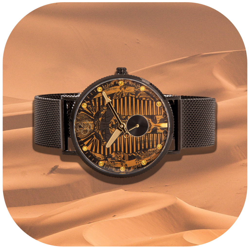 Subtly depicting the image of the Pharaoh, this classic Swiss Quartz timepiece uses the highest quality materials to create a watch that will effortlessly and boldly enhance your style. The black and gold contrast evokes the deserts of Egypt combined with the luxury of the Pharaoh – the King of Kings, ruling with leadership and awe.