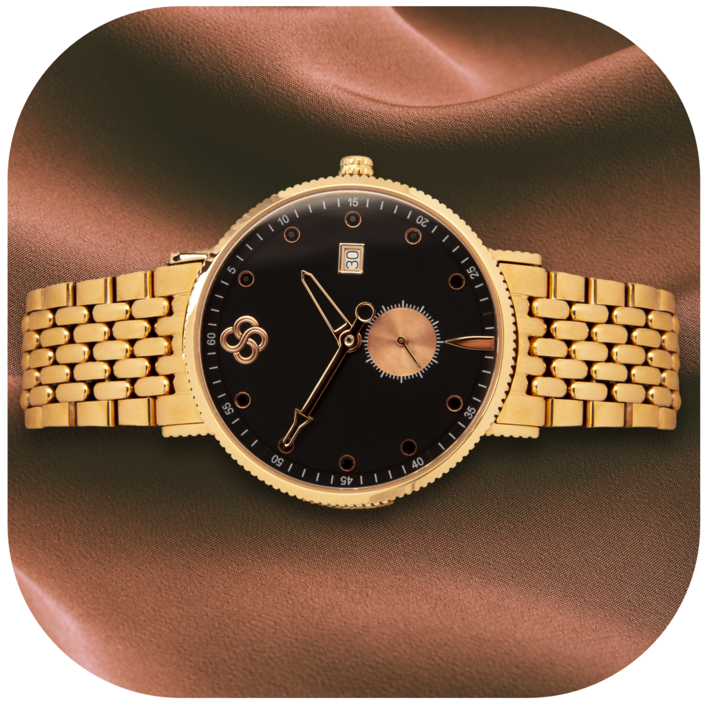 We take the deepest black polished surface on which to add the lightest touch of rose gold – enhancing the beauty of both, while creating a simple watch that reflects the night. The black gem hour markers are subtle, yet beautiful, while the deep black quilted strap brings the entire watch together. This watch is elegant and stylish.